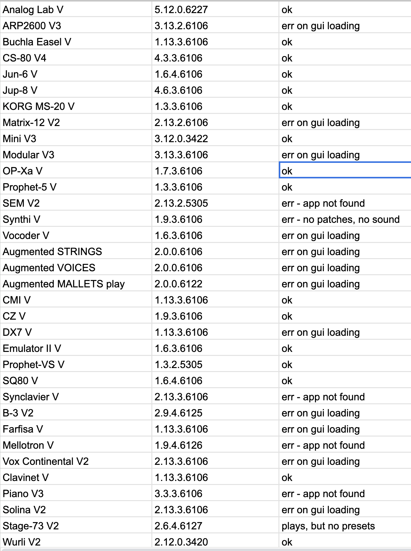 I have a Google sheet to try to keep track of my plugins, I’ve taken a screen shot of the Arturia instruments and if they work for me or not: