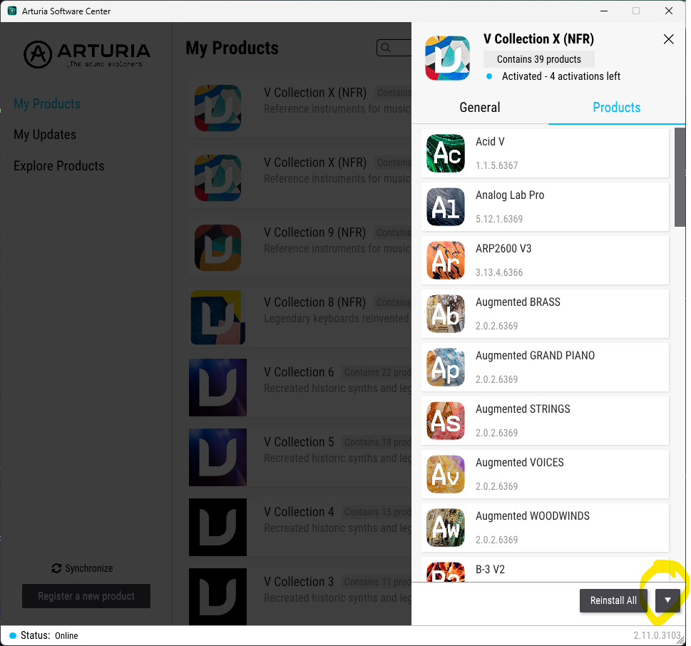 Then you can use ASC to uninstall each instrument one at a time, or, if you have ‘Collection’ licences, such as V-Collection X, X1 etc then just select it in ASC, then click on the down arrow as in the pic below and select ‘uninstall all’.