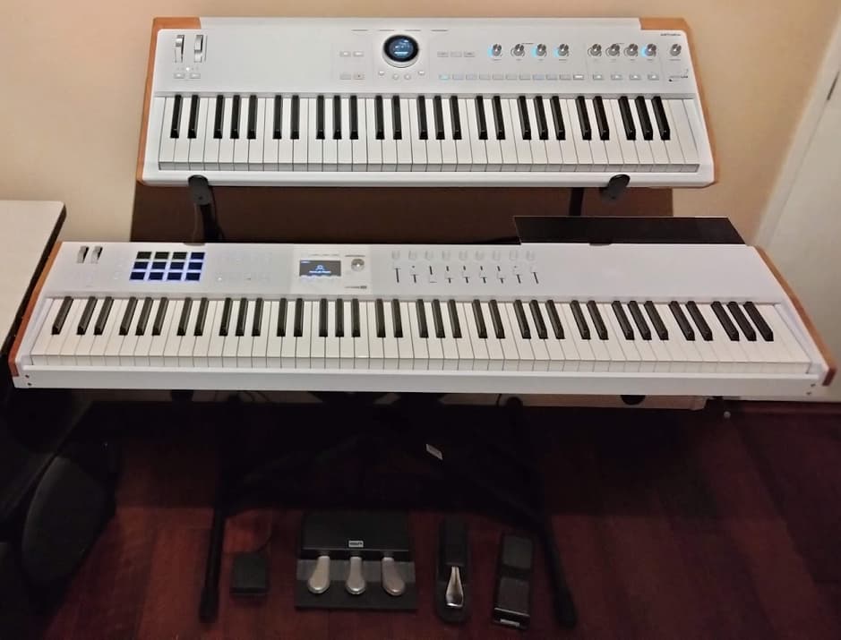 I received my Astrolab today and was delighted to discover that my Keylab MK3 could connect and be powered through the Storage/midi port on the back of the device, furthermore, the knobs and sliders all worked immediately and were, more or less, correctly mapped. I was also very pleased to find that I could, after playing with some settings, set up a layered sound assigning one part to the Astrolab keyboard and another to the keylab. Amazing, this has dramatically optimised my stage setup.