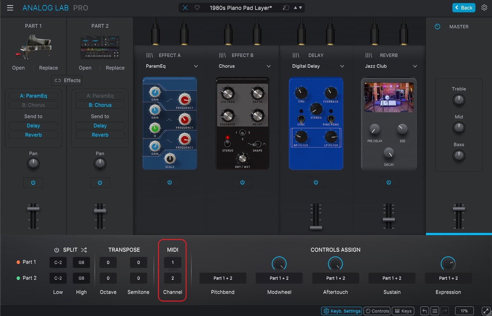 Another gripe is that the pitch and modulation wheels can’t, as far as I can tell, be assigned strictly to one “part”, even by changing the keylab in the midi control software so that the respective wheels are on the same specific midi channel as the keybed.