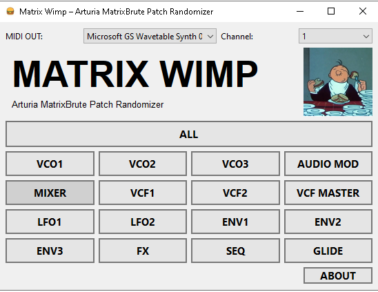 When I think of the MatrixBrute, it makes me think of Brutus from Popeye. So, I named this Randomizer program, MatrixWimp, for Wimpy the Hamburger Mooch. It’s also Wimpy because less than 80 parameters can be randomized (click on About inside the program). But, it is still an awesome and powerful tool. I have already randomized some next level sonic beauty (and weirdness)