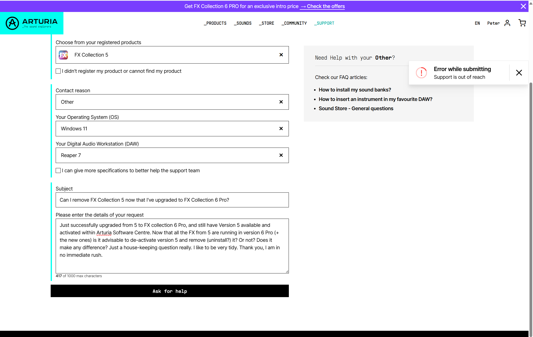 Also in passing. I tried using Arturia on-line help from within my Account to ask this question but constantly got failure error messages. (see enclosed screen-grab)