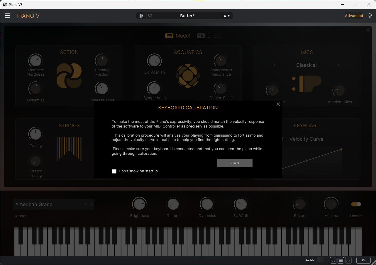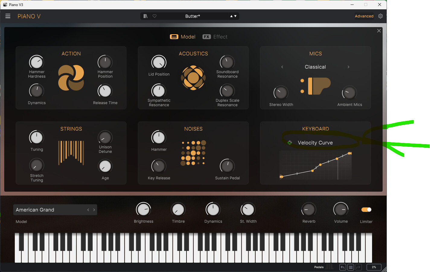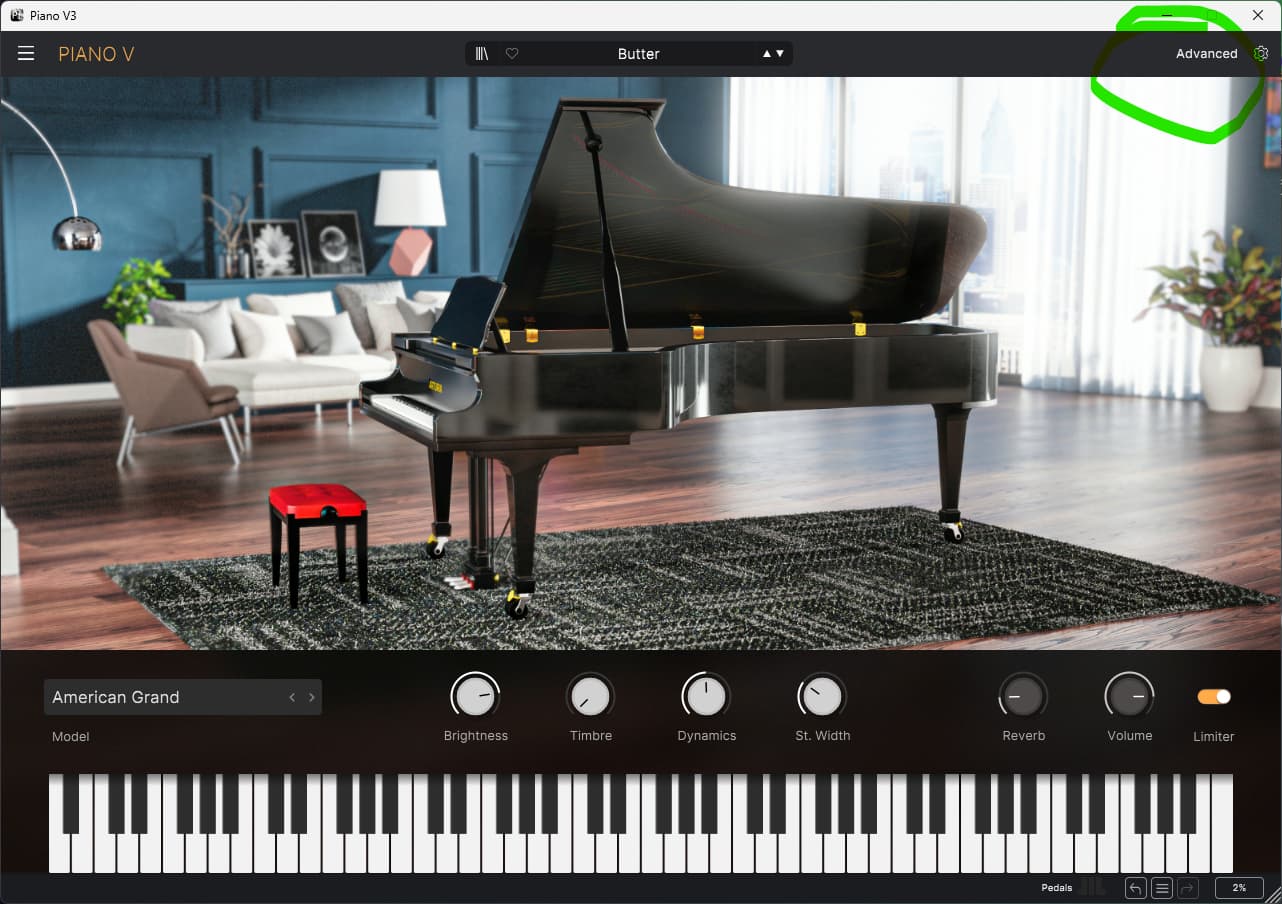 Here’s a pic of the ‘Butter’ preset in The Piano V instrument, i’ve highlighted the ‘Advanced’ tab you’ll need to click to go to the next step…