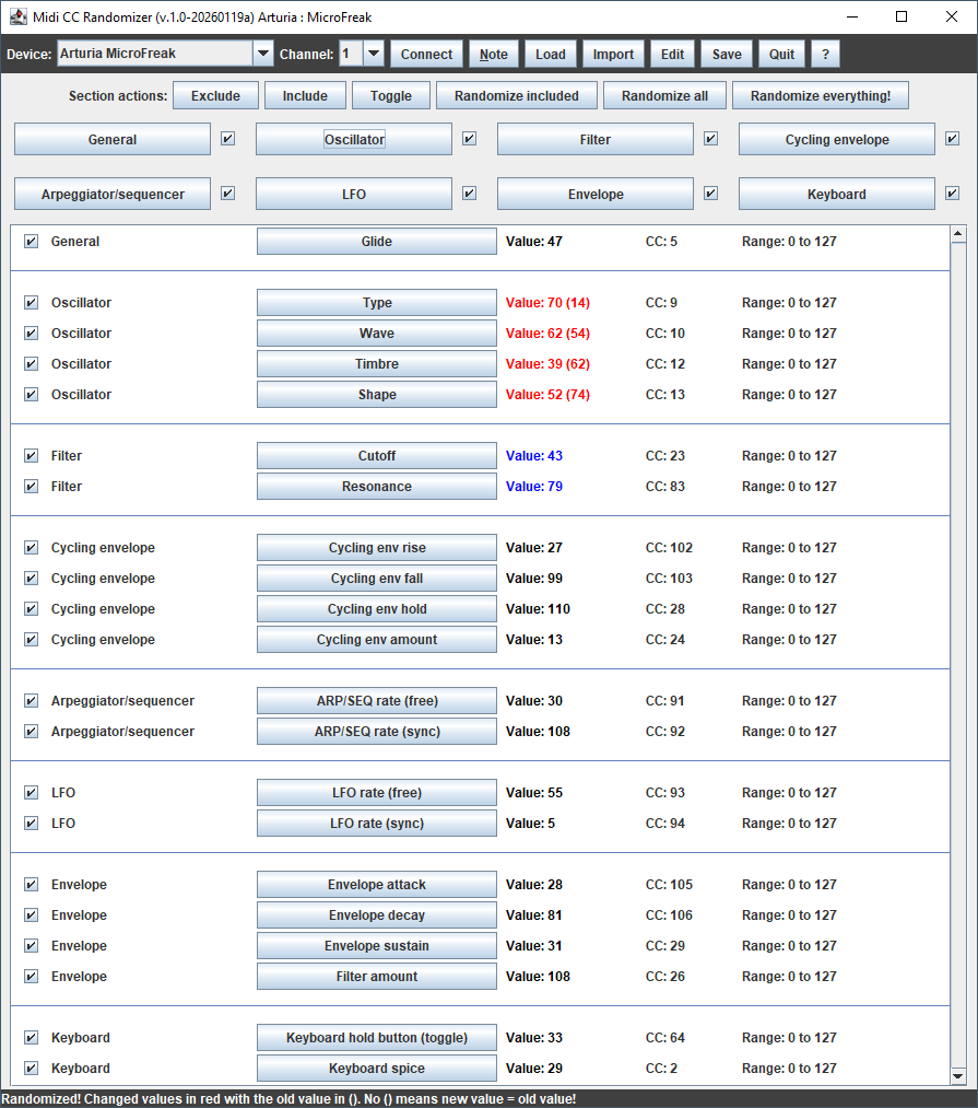 The window after randomizing the Oscillator (red values), and manually dragging the filter values with the mouse (blue values).