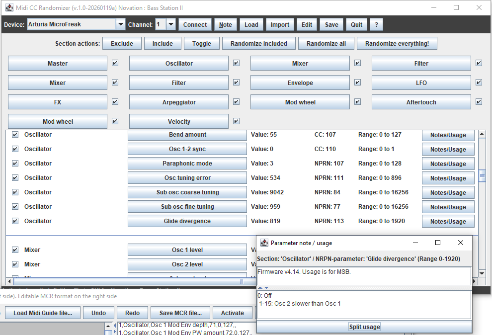 It defaults to Matrixbrute (as that was the starting point), but also include definitions for MicroFreak (tested), Polybrute (not tested) and Novation Mininova (tested) which are downloaded from the Midi Guide Project (https://github.com/pencilresearch/midi), and imported to MCR. More to come ![]()
