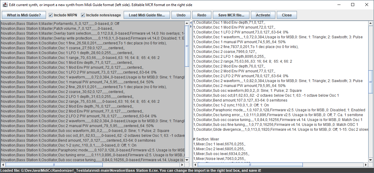 Load the csv-file fomr Midi Guide github page, then do any neccesary adjustments in the right edit window. The Activate button will update the GUI to verify the canges.