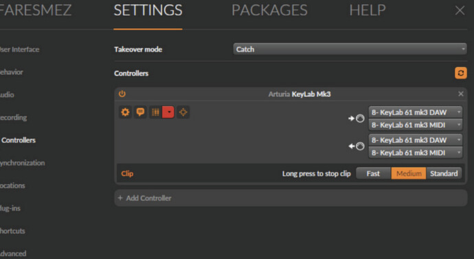 in daw mode, when i press the ‘launch all scenes button’ bottom right of Keylab screen, it launches all the clips as expected, but upon ‘long press’ it does not stop the clips as described in the manual