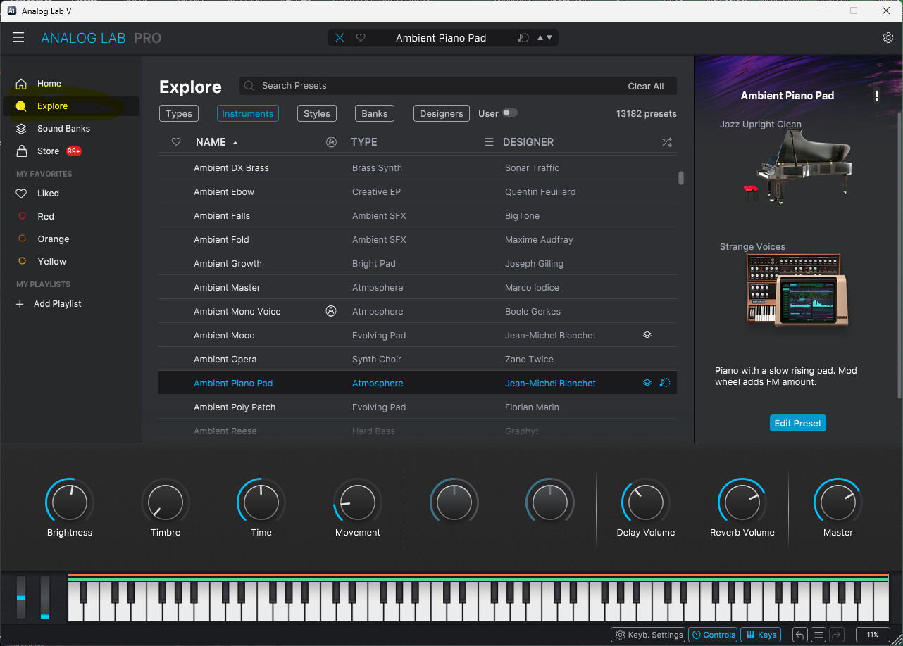 Then in the left hand column, click on 'Explore and you’ll see the following screen, then click on ‘Edit Preset’ as seen above the Reverb Vol and Master knobs at the bottom right side of the screen.