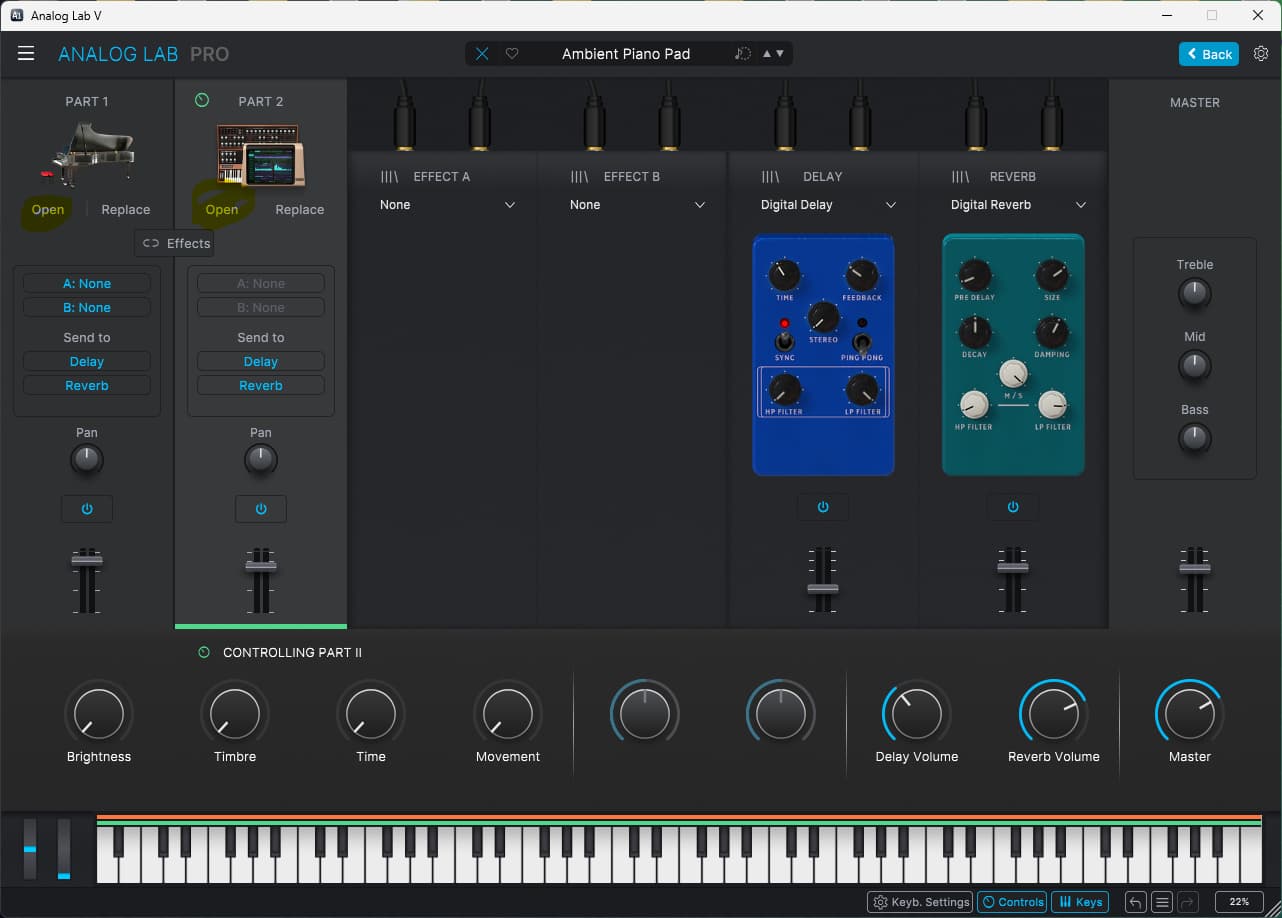 You’ll then see this screen, youll notice in the top left hand there are pictures of each instrument included in the preset, in this case Piano V in part one and Synclavier V in part two, just click on the ‘open’ text below either instrument to go to that specific instruments part of the preset.