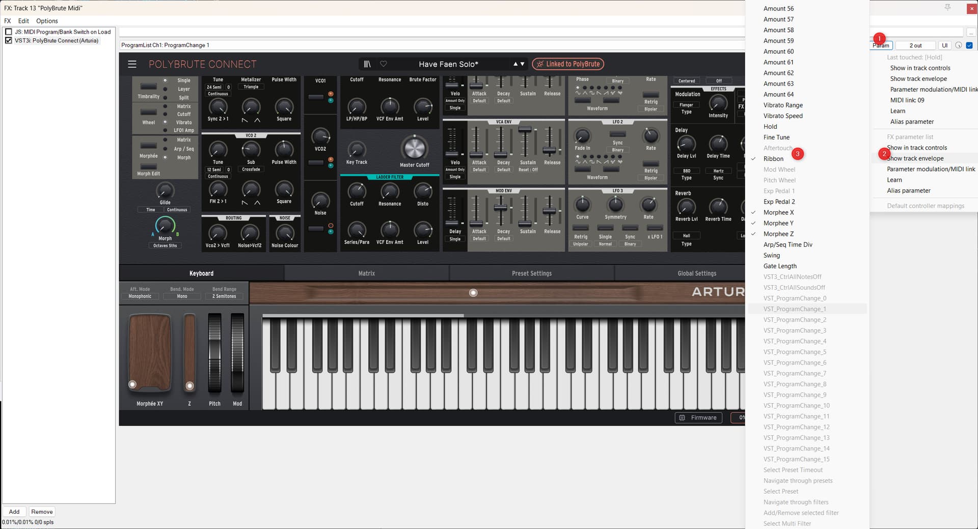 Have one track that has the PB Midi In Device and the PolyBruteConnect VST.
